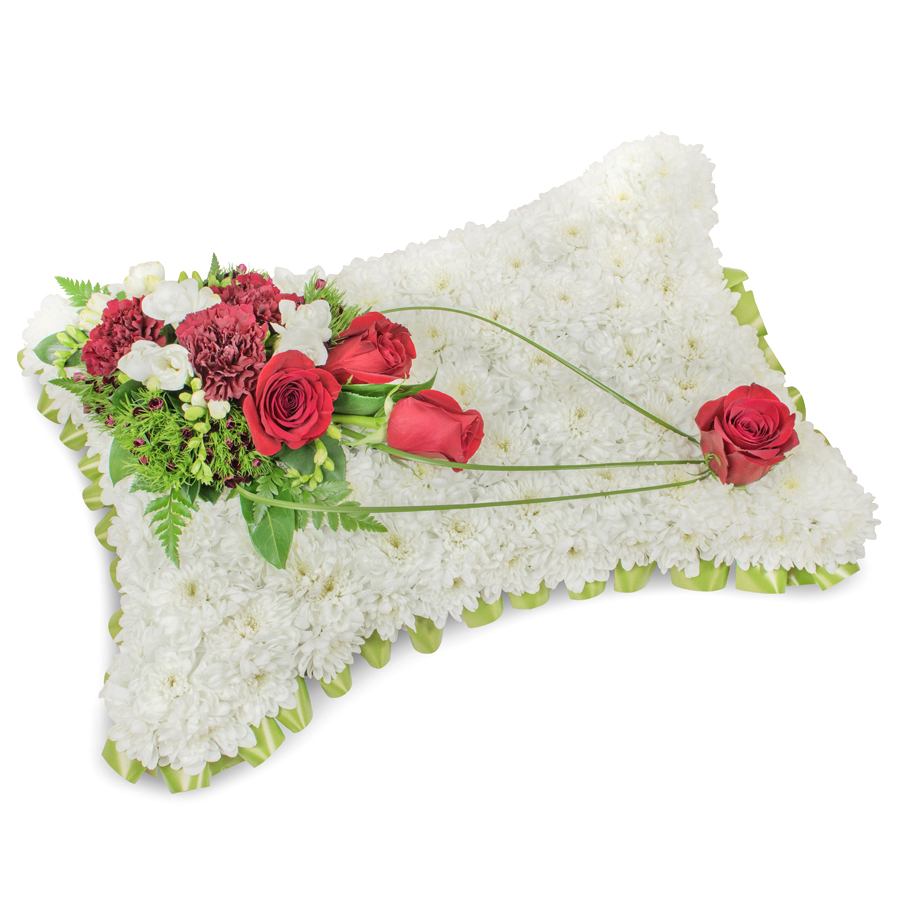 Send your heartfelt condolences with our exquisitely crafted bouquet featuring white chrysanthemums, vibrant red roses, fragrant white freesias, rich dark red carnations, delicate dianthus, and bear grass.